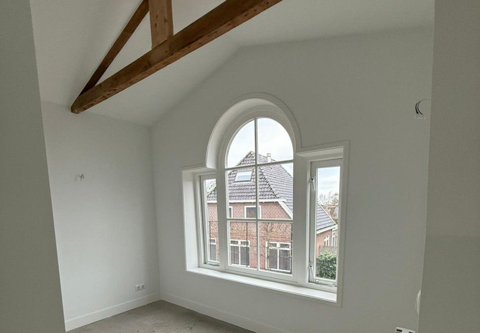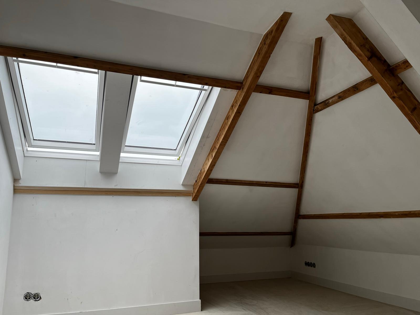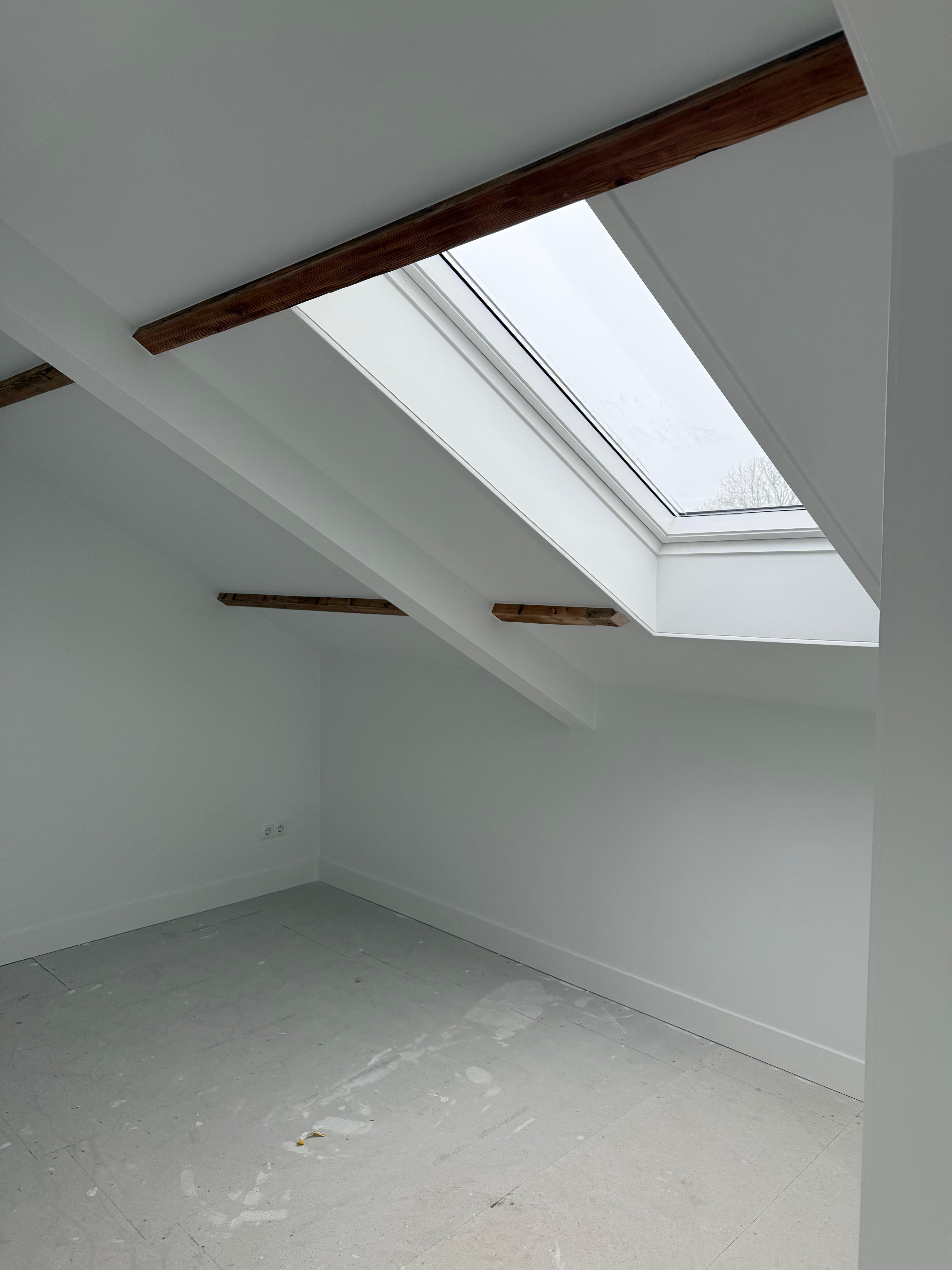 Het bijzondere element is de houten balkconstructie in het plafond, die we bewust in het zicht hebben gehouden voor een warme, authentieke uitstraling. Met het nieuwe raamkozijn en de strakke afwerking komt het licht prachtig binnen en krijgt de ruimte karakter.