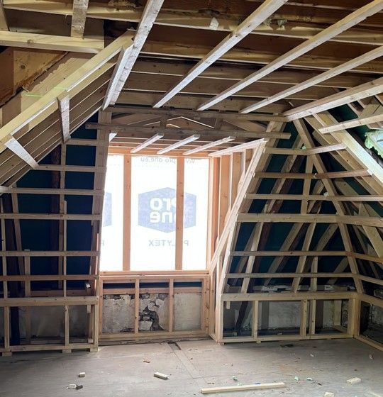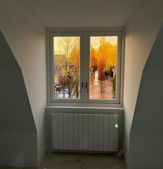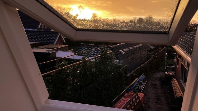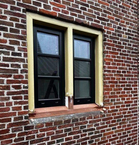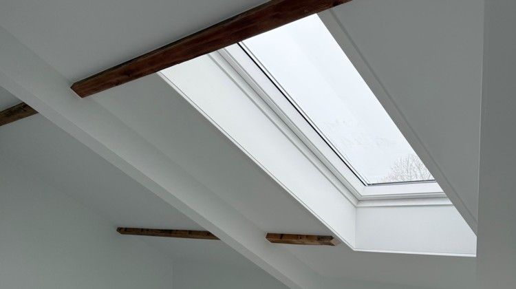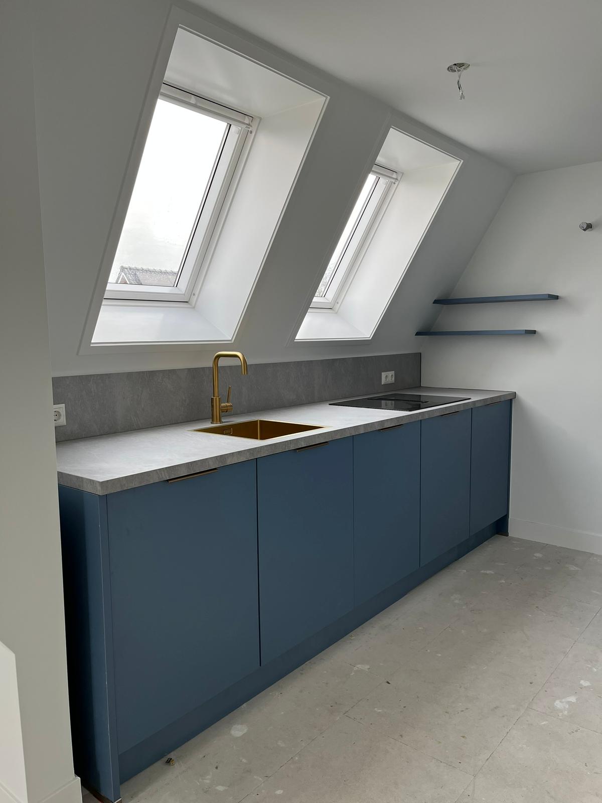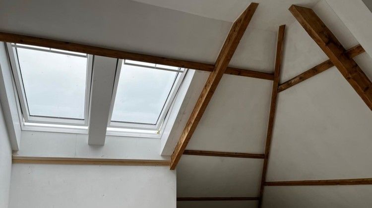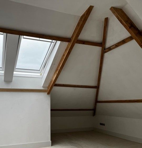 Het bijzondere element is de houten balkconstructie in het plafond, die we bewust in het zicht hebben gehouden voor een warme, authentieke uitstraling. Met het nieuwe raamkozijn en de strakke afwerking komt het licht prachtig binnen en krijgt de ruimte karakter.